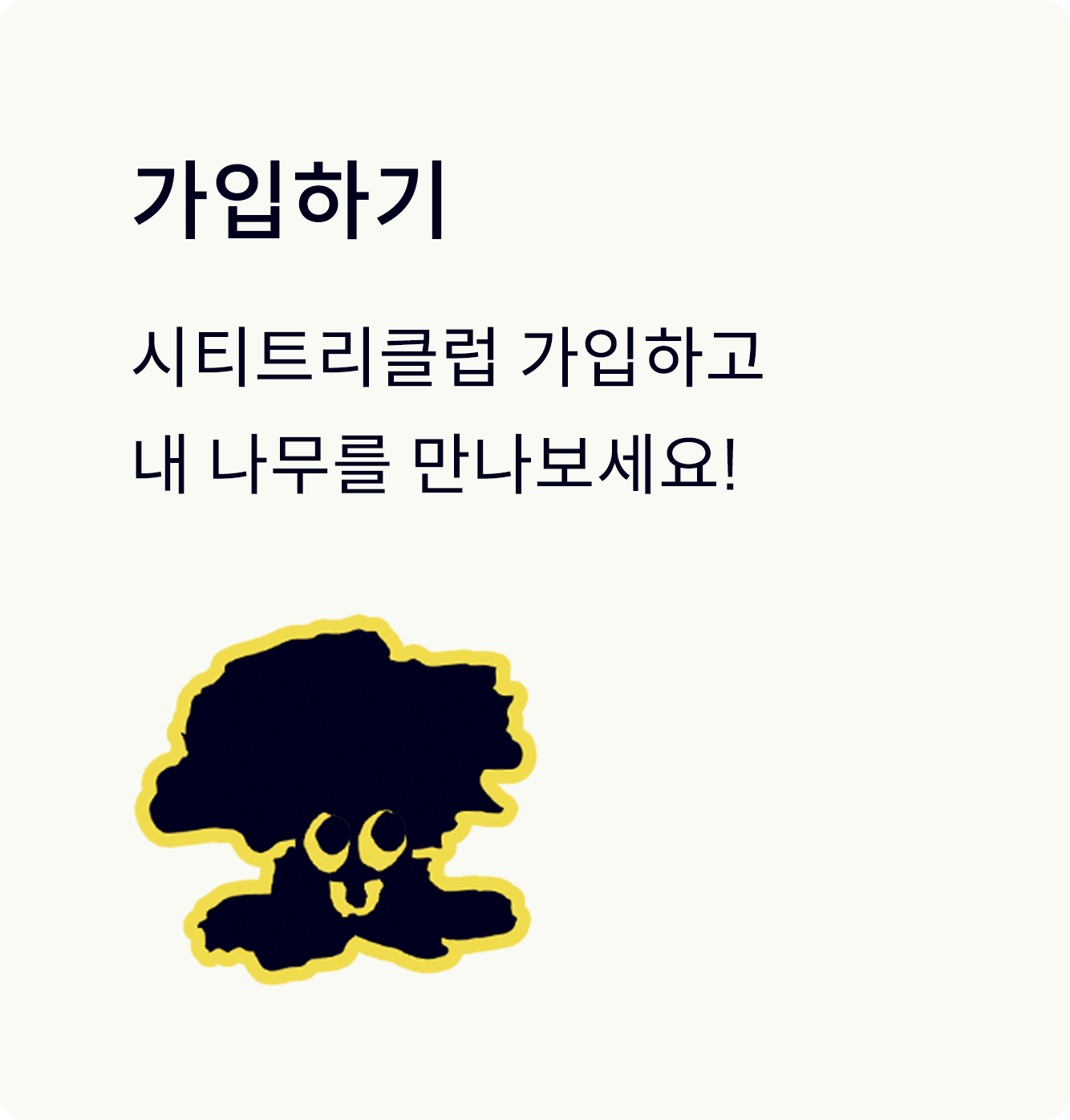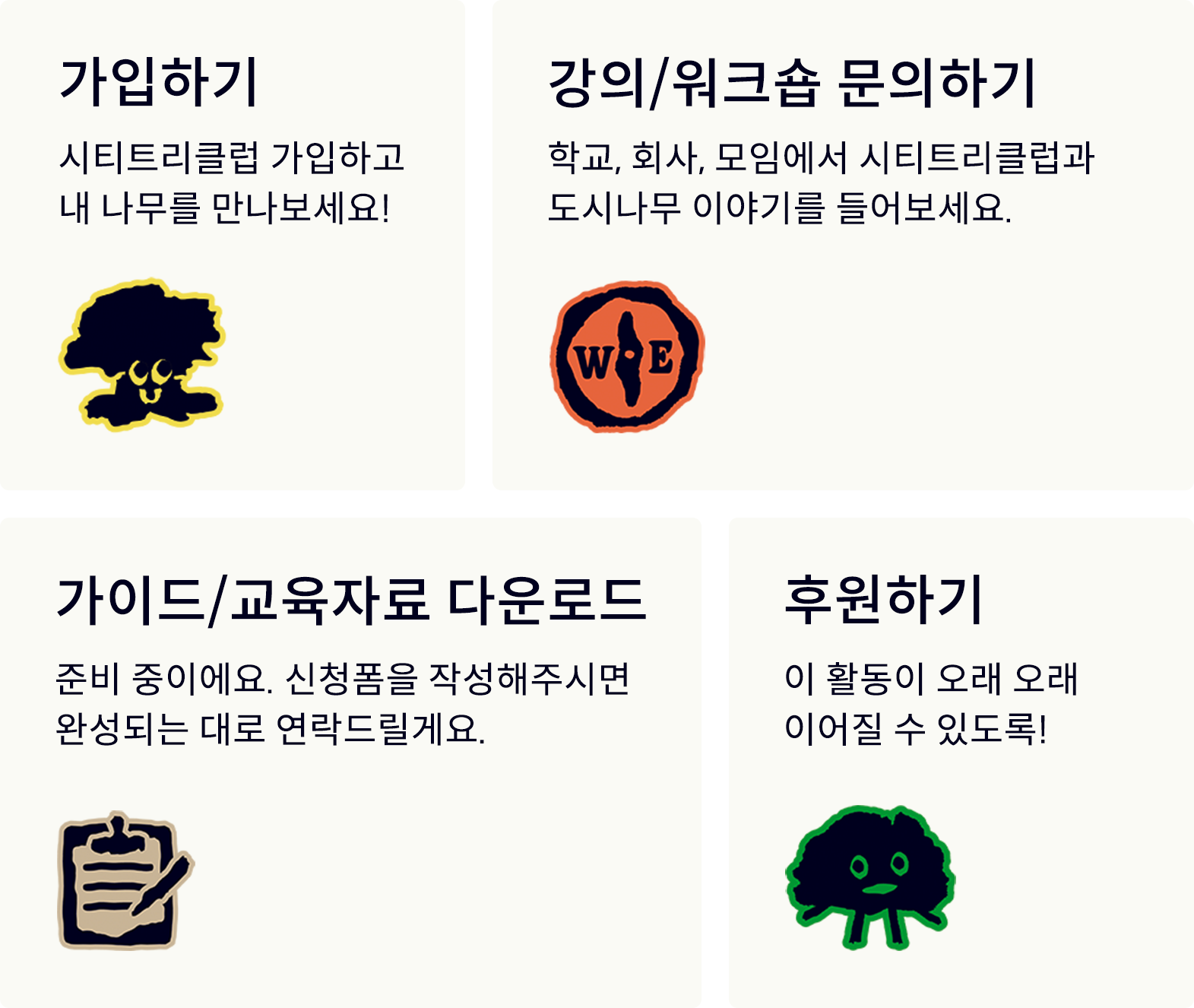 시티트리클럽과 함께해요 / 가입하기 / 시티트리클럽 가입하고 내 나무를 만나보세요! / 강의/워크숍 문의하기 / 학교, 회사, 모임에서 시티트리클럽과 도시나무 이야기를 들어보세요 / 가이드/교육자료 다운로드 / 준비중이에요. 신청폼을 작성해주시면 완성되는 대로 연삭드릴게요. / 후원하기 / 이 활동이 오래오래 이어질 수 있도록!