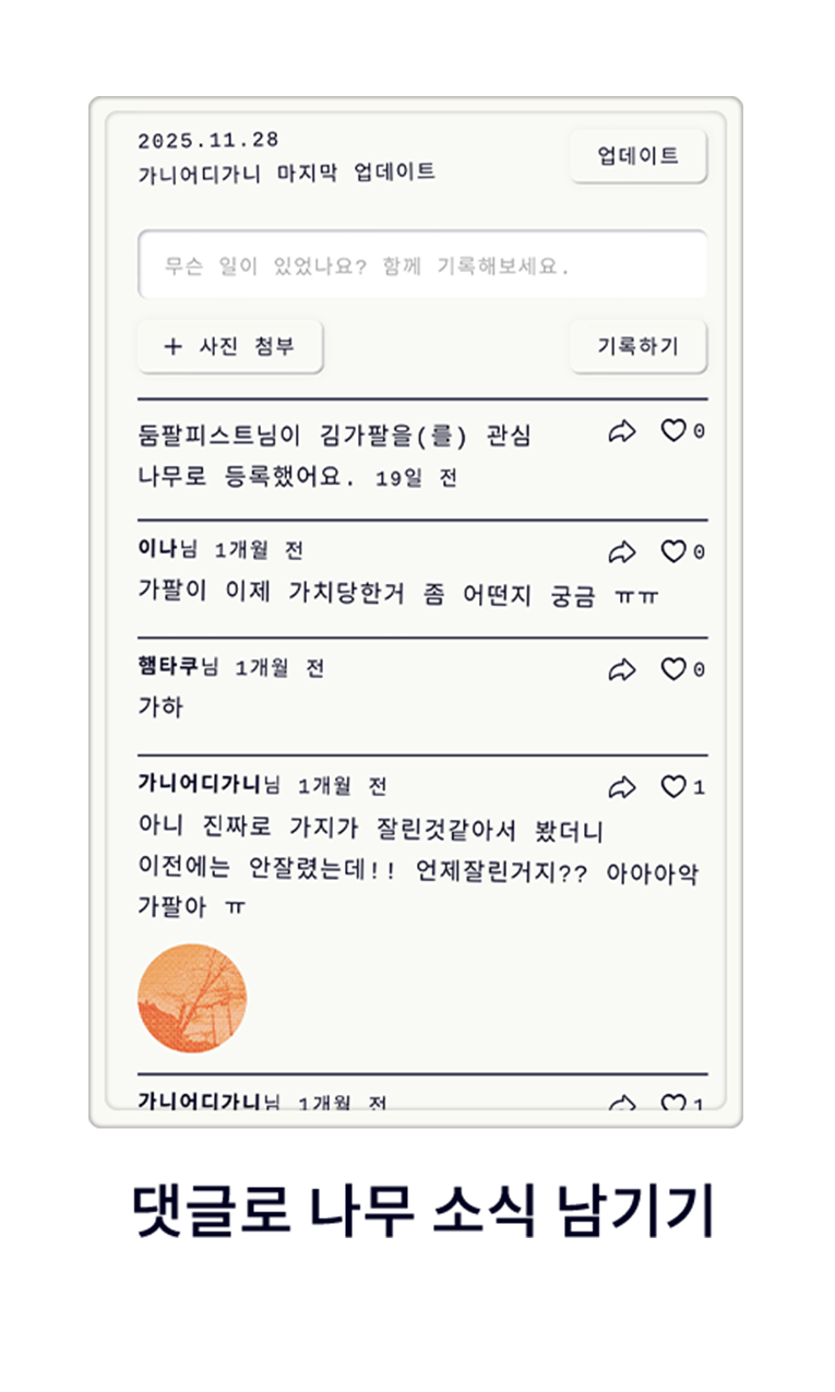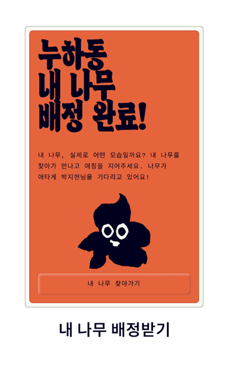 나무를 통해 자연과 환경, 그리고 사람들과 연결되는 감각은 처음이었습니다. 늘 혼자의 감상에 머물렀던 시간이었는데, 이번 경험은 무척 새롭고 충만하게 다가왔어요. 계절이 바뀔 때 안부 메시지가 오거나, 절기별 나무 이벤트가 열린다면 ‘배정’에서 끝나는 관계가 아니라 건강한 우정으로 이어질 수 있을 것 같아요.