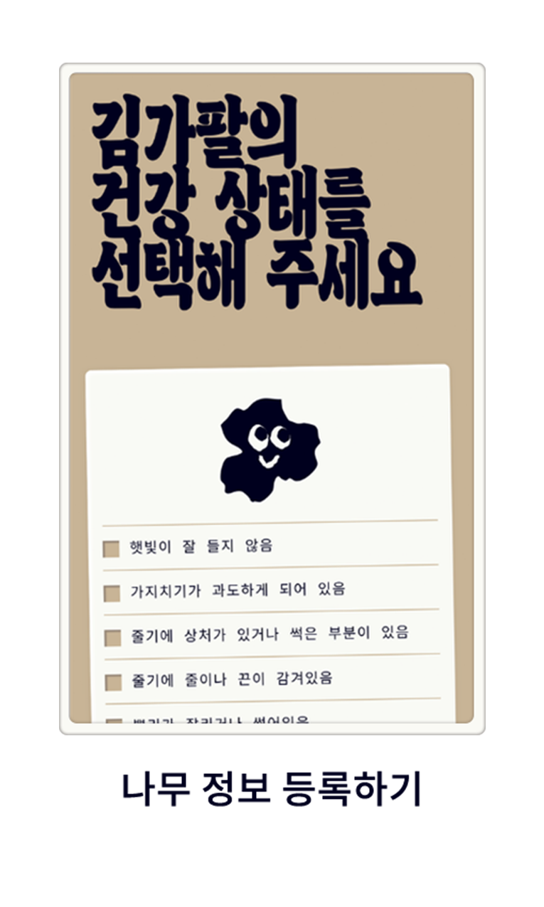 시티트리클럽에서는 무엇을 하나요? 나무의 건강 상태를 확인하고 등록해요 가지치기, 뿌리, 햇빛 등 눈으로 확인할 수 있는 항목을 선택해 오늘의 변화를 남길 수 있습니다. 사진과 함께 기록도 추가할 수 있어요.