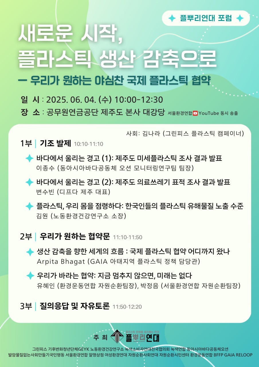 내용 : 5일 오전에는 플뿌리 소속 단체와 제주도민 3명이 2025 세계 환경의 날 행사장 앞에서 새로 출범하는 정부에 플라스틱 생산 감축을 촉구하는 기자회견을 진행합니다. 기자회견은 제주 바다에서 생업을 유지하는 김정도 어부와 이유정 해녀의 제주 바다 플라스틱 오염 실태 증언으로 시작합니다. 이어 제주 종달초 3학년 최하민 어린이가 제주에 살면서 직접 보고 느낀 플라스틱 오염 문제를 바탕으로 생산 감축을 하지 않는 어른들에게 책임을 묻습니다. 마지막으로 BFFP(Break Free From Plastic)의 Faye Ferrer 활동가가 국제사회의 구성원으로서 플라스틱 생산 감축을 위한 한국 정부 역할의 중요성을 강조합니다. 국제 플라스틱 협약의 최종 협상을 2개월 앞둔 지금, 플뿌리연대는 이 기자회견을 통해 정부에 국제사회와 함께하는 책임 있는 국가로서의 역할을 요구하며 새 정부가 플라스틱 생산 감축이라는 과제와 함께 출발할 수 있도록 견인하고자 합니다.