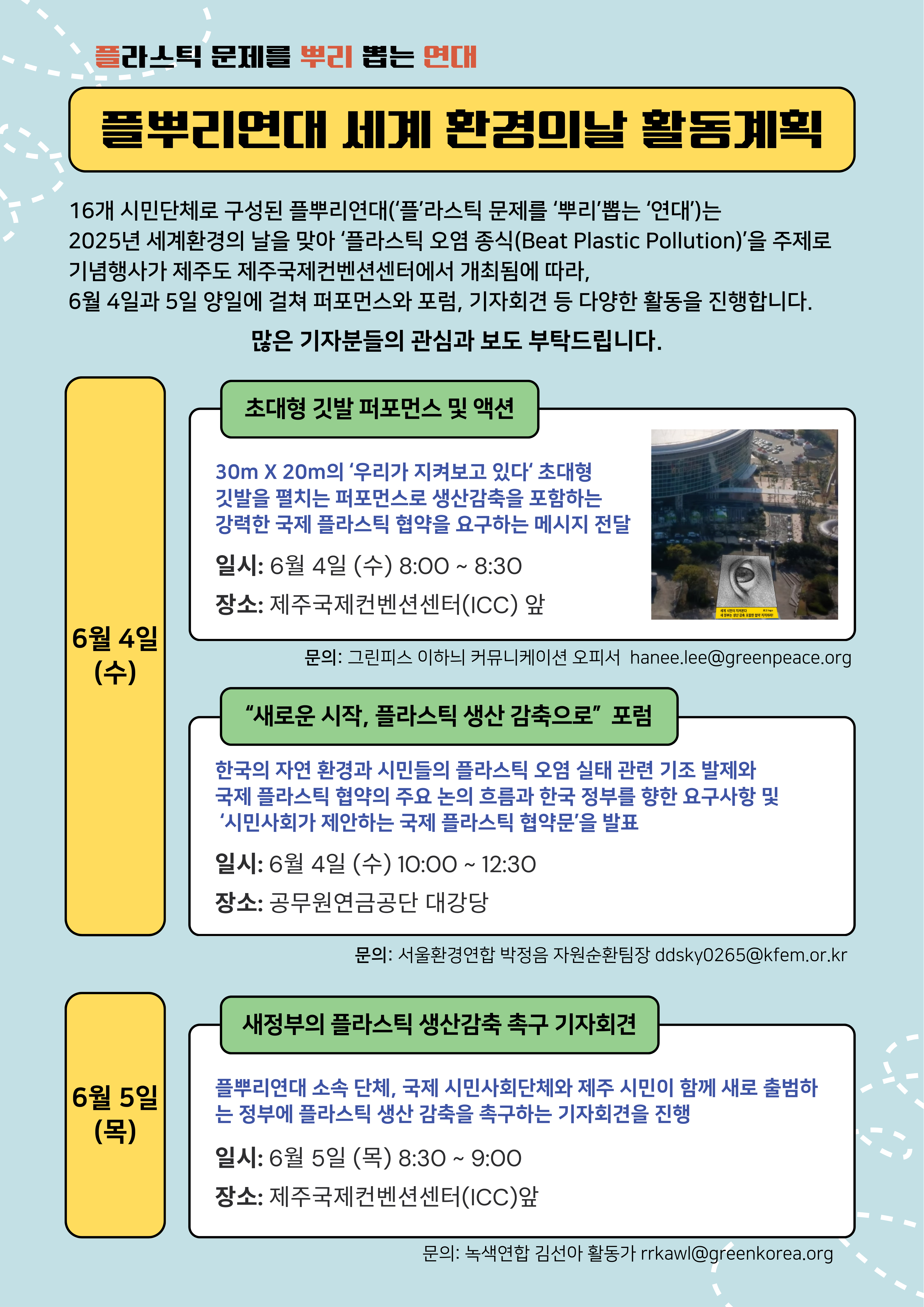 오는 6월 4일, 5일 ‘플라스틱 오염 종식(Beat Plastic Pollution)’을 주제로 2025년 세계환경의 날 기념행사가 제주도 제주국제컨벤션센터에서 개최됩니다. 이에 16개 시민단체로 구성된 플뿌리연대는 4일과 5일 양일에 걸쳐 1) WeAreWatching 초대형 깃발 퍼포먼스 2) 제주의 플라스틱 오염 실태 및 우리가 원하는 야심찬 국제 플라스틱 협약을 발표하는 포럼, 그리고 3) 새 정부에 플라스틱 생산 감축을 촉구하는 기자회견을 진행합니다.