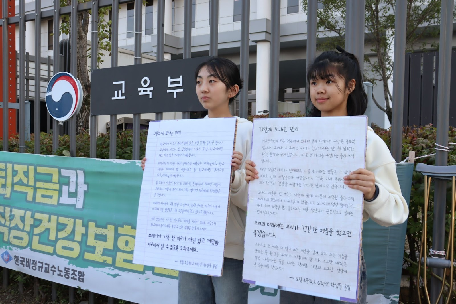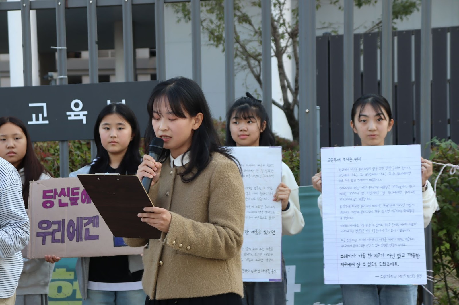 편지를 낭독한 정시아, 변지유 학생이 교육부 앞에서 편지를 들고 서있다. ⓒ서울환경연합