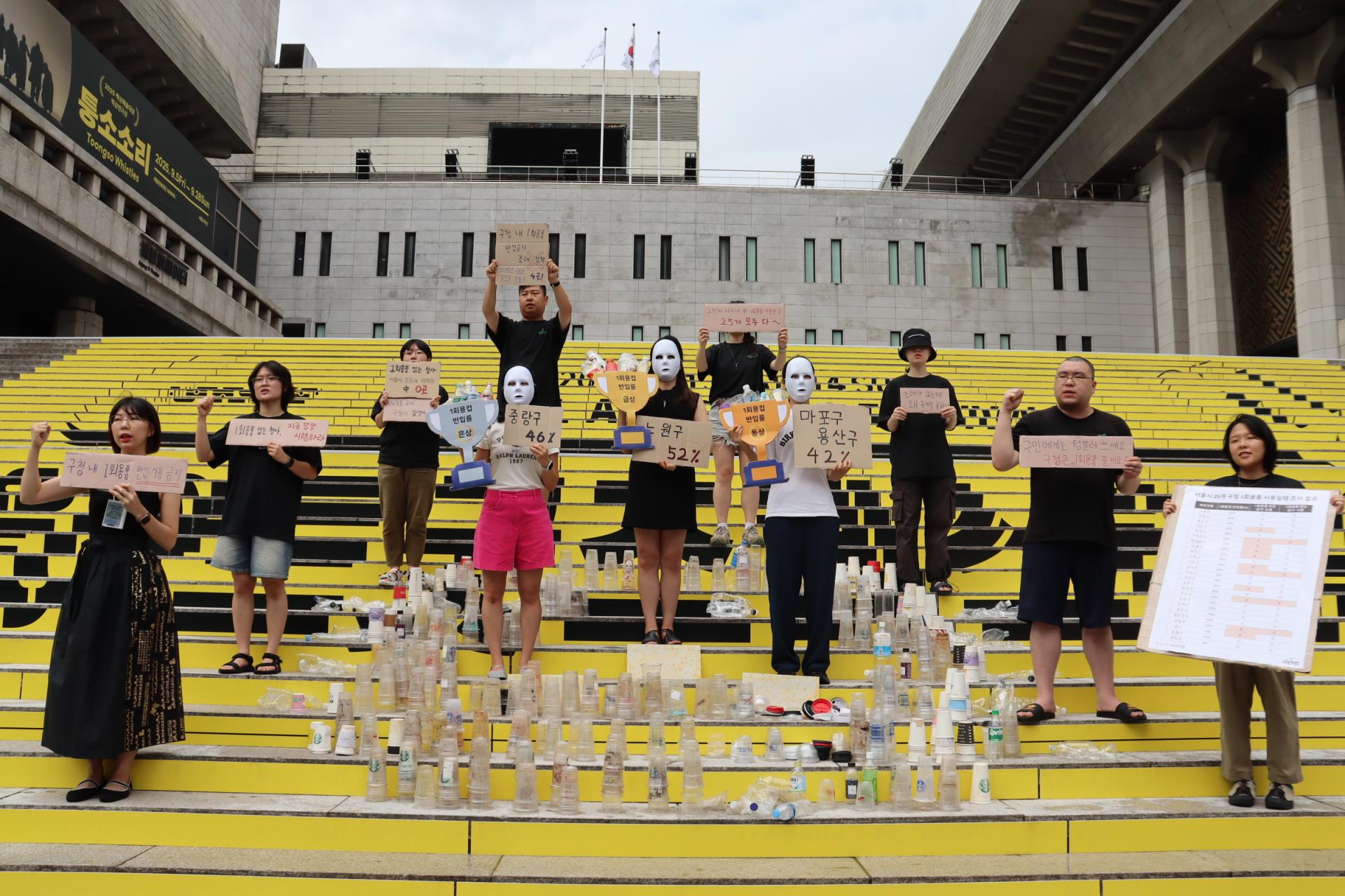 ○ 오늘 9월 4일(목) 오전 11시, 서울환경연합이 자원순환의 날(9월 6일)을 앞두고 세종문화회관 계단에서 말뿐으로 그친 “구청 내 1회용품 사용 금지 조례”에 구청의 무책임을 지적하며 조례 개정과 철저한 이행을 강력히 촉구하는 기자회견을 진행했다.