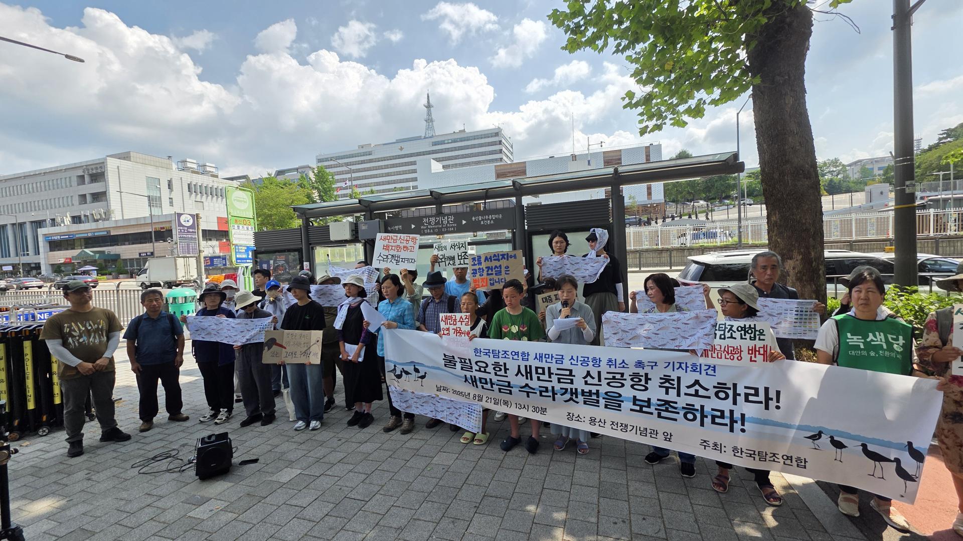 이들은 21일 오후 서울 용산 전쟁기념관 정문 앞에서 기자회견을 열고 정부의 새만금 신공항 건설 계획은 새만금에 마지막 남은 생태 공간 수라갯벌을 회복 불가능할 지경으로 파괴할 뿐 아니라 항공기의 조류 충돌 위험까지 높인다면서 전면적인 사업 철회를 촉구하는 성명을 발표했다.