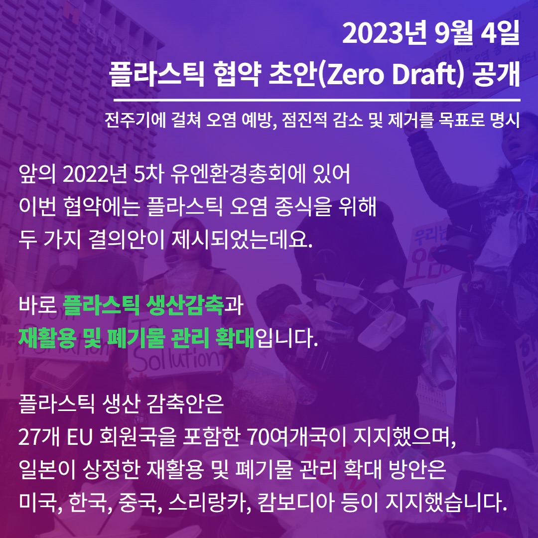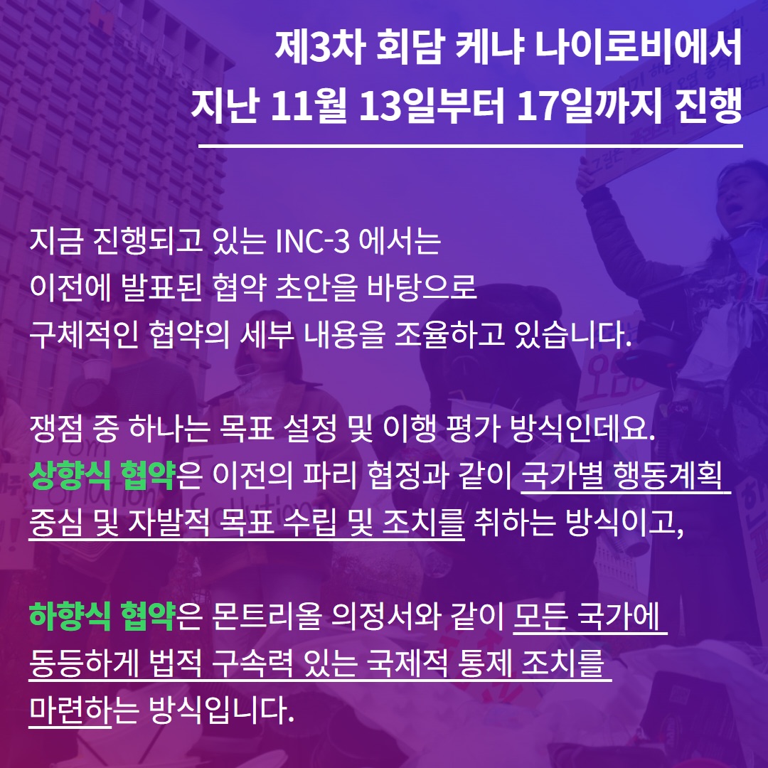 ์ 5์ฐจ ์ ์ํ๊ฒฝ์ดํ์์ 'ํ๋ผ์คํฑ ์ค์ผ ์ข ์์ ์ํ ๋ฒ์ ๊ตฌ์๋ ฅ ์๋ ๊ตญ์ ํ์ฝ ์ถ์ง ๊ฒฐ์์'์ด ์ฑํ๋์์ต๋๋ค. ์ด ํ์ฝ ์ ์ ์ ์ํด 2022๋ ํ๋ฐ๊ธฐ๋ถํฐ ๋ค์ฏ ์ฐจ๋ก์ ์ ๋ถ ๊ฐ ํ์์์ํ(INC)๋ฅผ ๊ฐ์ต, 2024๋ ๋ง์๋ ์ฑ์ ์ ์ ์ ๋ชฉํ๋ก ํ๊ณ ์์ต๋๋ค.