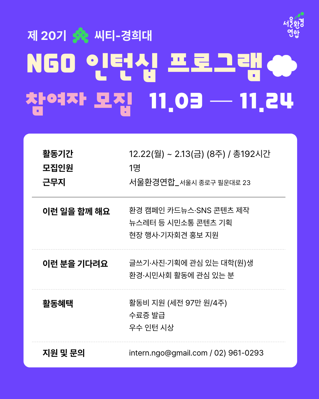 서울환경연합은 서울의 환경을 지키고, 시민과 함께 행동하는 환경단체입니다. 이번 동계 인턴십에서는 환경 이슈를 시민의 언어로 전할 미디어홍보팀 인턴을 모집합니다!💚