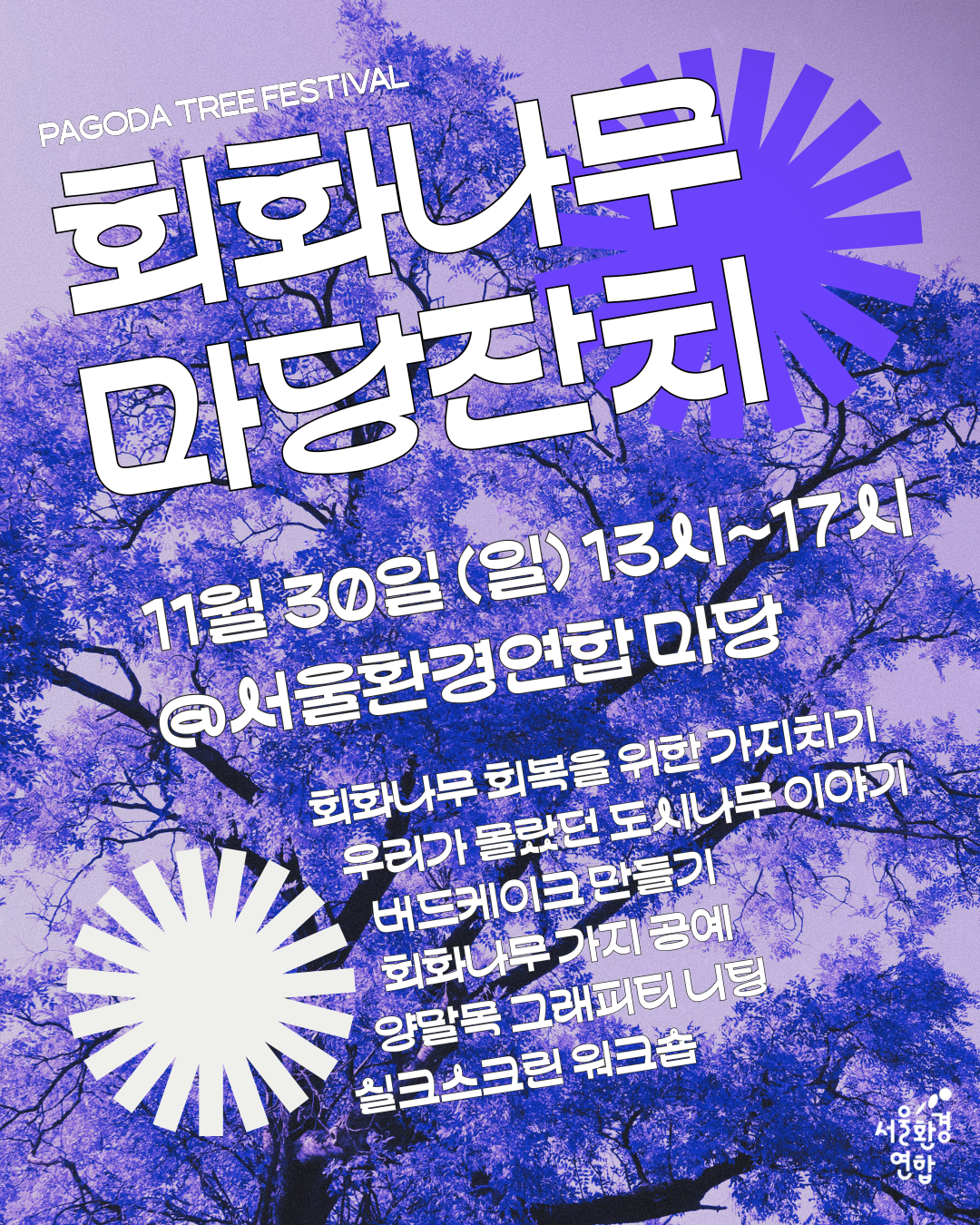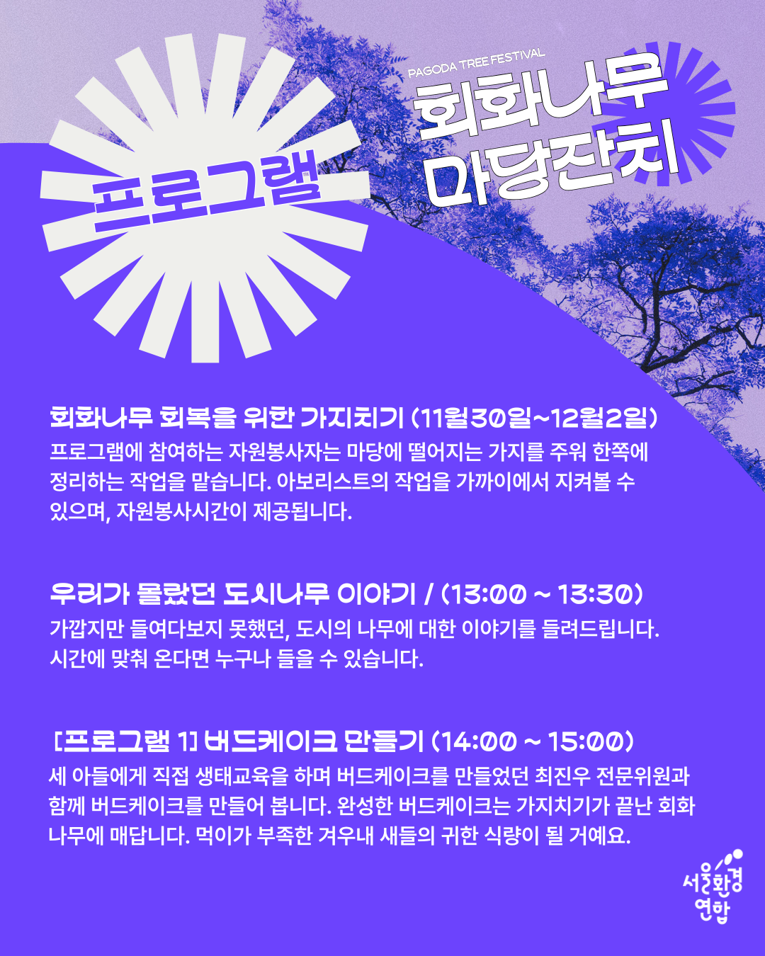 회화나무 가지치기하는 날, 나무 아래서 우리의 마음을 모으는 작은 잔치를 엽니다. 회복 전정에 자원봉사로 기여하고 싶은 분들, 그리고 잔치에 참여하실 분들 11월 30일에 마당에 놀러오세요!