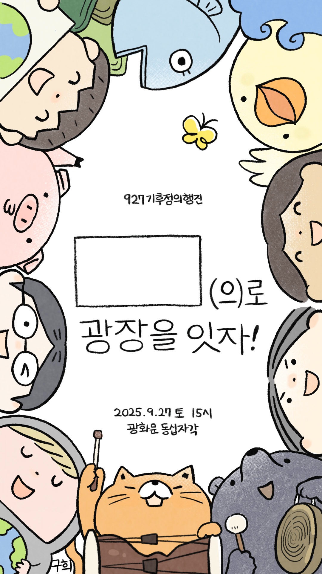 “지난 4년간 기후정의행진에 참여하며 느낀 것은 감동과 흥겨움이었습니다. 슬픔만이 아니라 희망과 즐거움이 함께 있었죠. 그 경험을 담아, 사람과 동물이 함께 즐겁게 행진하는 피켓을 디자인했습니다. 올 9월 27일, 모두가 자유롭고 평등하게 목소리 내는 날이 되길 바랍니다. 광장에서 만나요!”