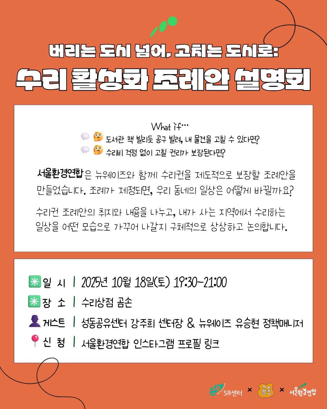 이번 설명회에선 수리권 조례안의 취지와 내용을 나누고, 내가 사는 지역에서 수리하는 일상을 어떻게 가꾸어 나갈지 구체적으로 상상해봅니다.