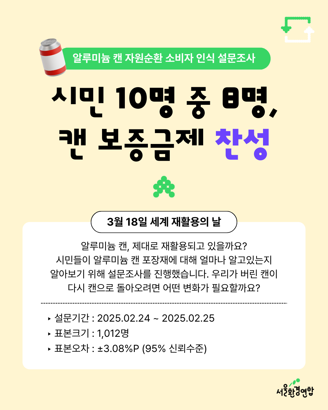 서울환경연합과 노벨리스가 진행한 설문조사에서 시민 10명 중 8명이 캔 보증금제 도입에 찬성한다고 답했습니다. 하지만 정작 우리가 분리배출한 알루미늄 캔이 다시 캔으로 재탄생하는 비율은 단 30%에 불과합니다.😨