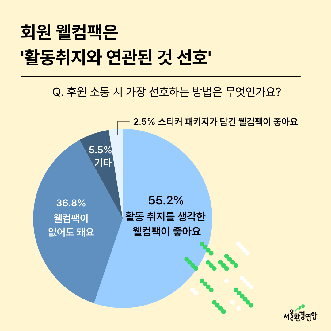 신규 가입 시 보내드리는 웰컴팩은 활동 취지를 생각한 웰컴팩이 좋다 하셨고, 웰컴팩을 선택지로 했으면 좋겠다는 것과 해당 질문을 적을 때 너무 고민을 해서 그랬는지 질문이 어렵다, 이해가 안 간다는 몇몇 분들의 기타 의견도 있었어요.