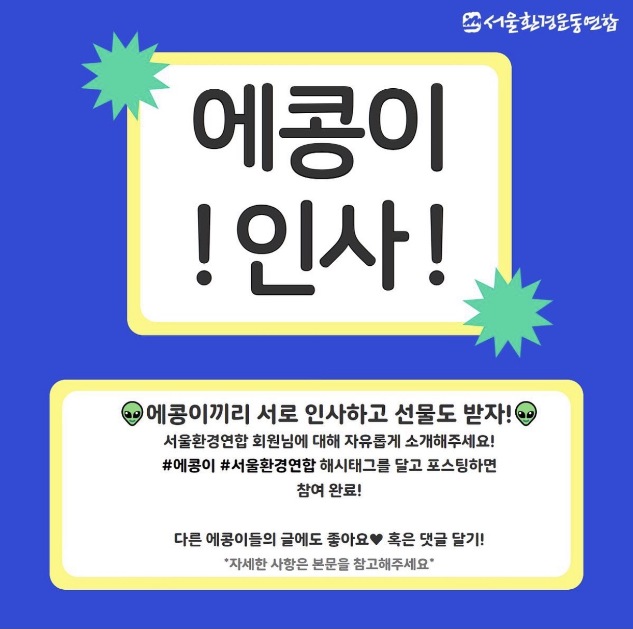 서울환경연합을 응원해 주시는 회원님들의 이름이 생겼습니다! 바로 ‘에콩이’인데요, 환경을 뜻하는 에코와 회원들이 동그랗게 둘러선 모습을 형상화한 ㅇ을 합친 이름입니다. 서울환경연합 회원인 ‘나’를 소개하고 다른 에콩이들과 공유하는 ‘에콩이 인사’캠페인까지 진행했습니다. 멋진 이름도 생겼으니 앞으로의 시민참여 캠페인에서 에콩이분들의 활약을 기대해도 좋을 것 같습니다!