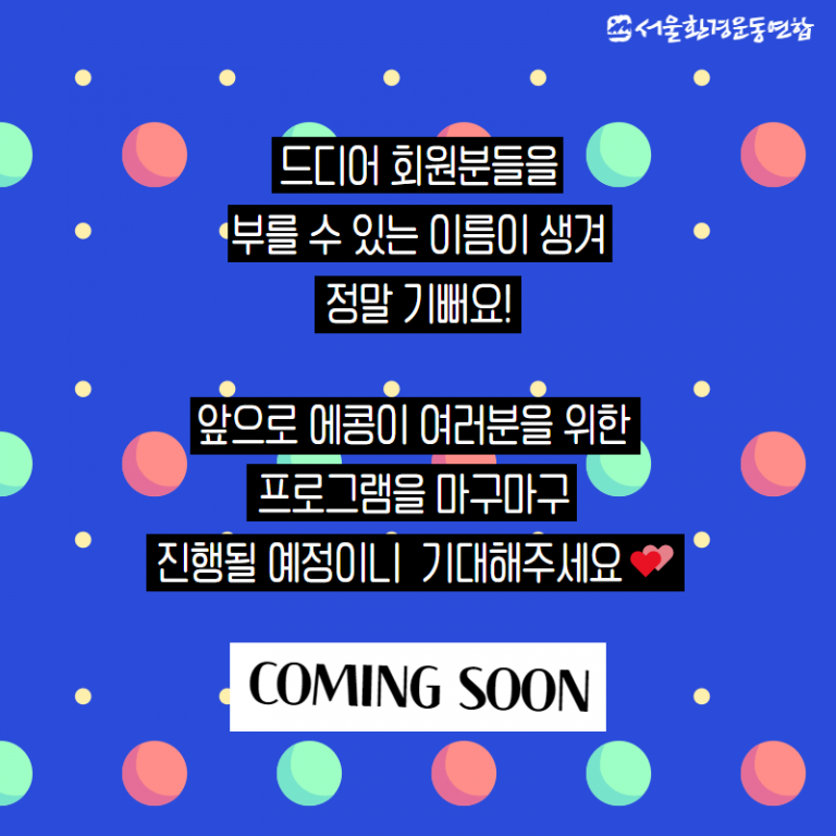 앞으로 ‘에콩이’라는 이름을 시작으로 서울환경연합 회원 여러분을 위해 프로그램을 마구마구 진행할 예정이니 기대 많이 해주세요!