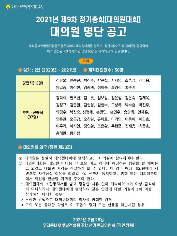 우리동네햇빛발전협동조합은 제9차 대의원대회를 앞두고, 정관 제22조 및 대의원선출규약에 따라 선정된 제3기 대의원 명단 50명을 아래와 같이 공고합니다.