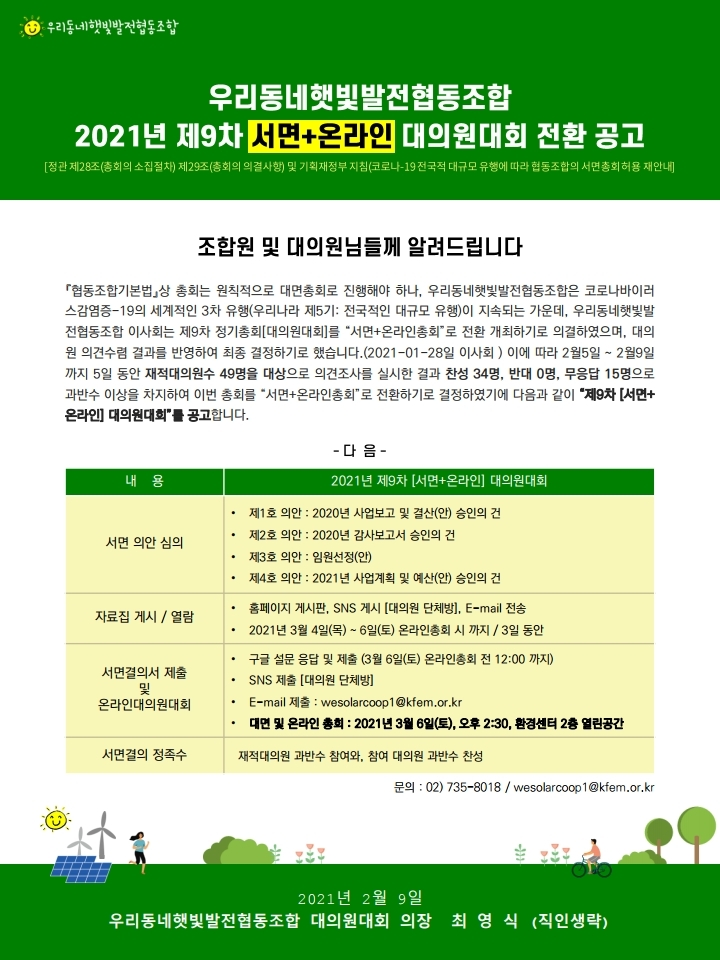 『협동조합기본법』상 총회는 원칙적으로 대면총회로 진행해야 하나, 우리동네햇빛발전협동조합은 코로나바이러스 감염증-19의 세계적인 3차 유행(우리나라 제5기: 전국적인 대규모 유행)이 지속되는 가운데, 우리동네햇빛발전협동조합 이사회는 제9차 정기총회[대의원대회]를 “서면+온라인총회”로 전환 개최하기로 의결하였으며, 대의원 의견수렴 결과를 반영하여 최종 결정하기로 했습니다. (2021-01-28일 이사회 )