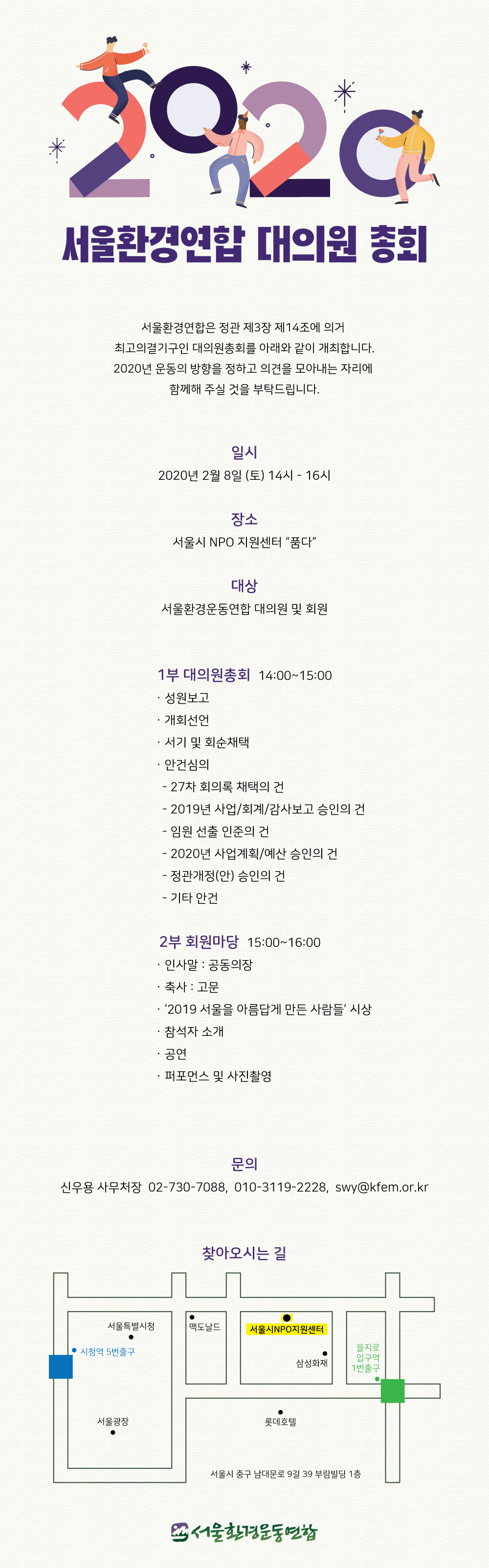 서울환경연합은 정관 제3장 제14조에 의거 최고의결기구인 대의원총회를 아래와 같이 개최합니다. 2020년 운동의 방향을 정하고 의견을 모아내는 자리에 함께해 주실 것을 부탁드립니다.