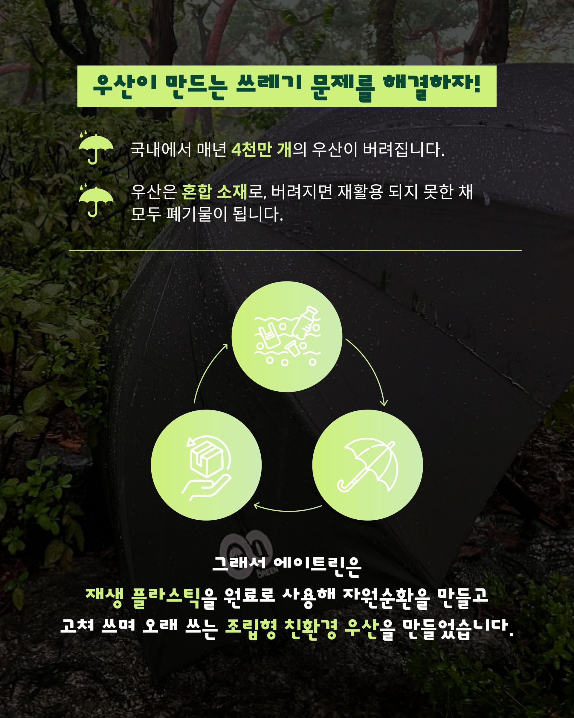 우산은 자주 사용하는 생활용품이지만 친환경 우산이 없다는 사실에 약3️⃣년간 우산 개발에 매진했습니다!
